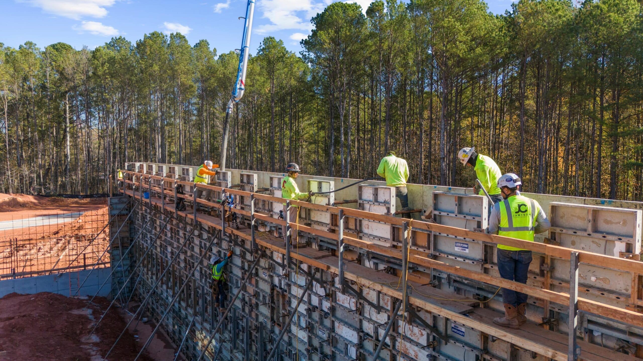 Jamison Construction builds engineered cast-in-place (CIP) concrete wall systems across the Southeast. Our team handles layout, forming, reinforcement, and vertical pours for a variety of commercial and structural applications. Whether it’s a retaining wall, structural core, or part of a podium-level build, we deliver strength and quality from the ground up.